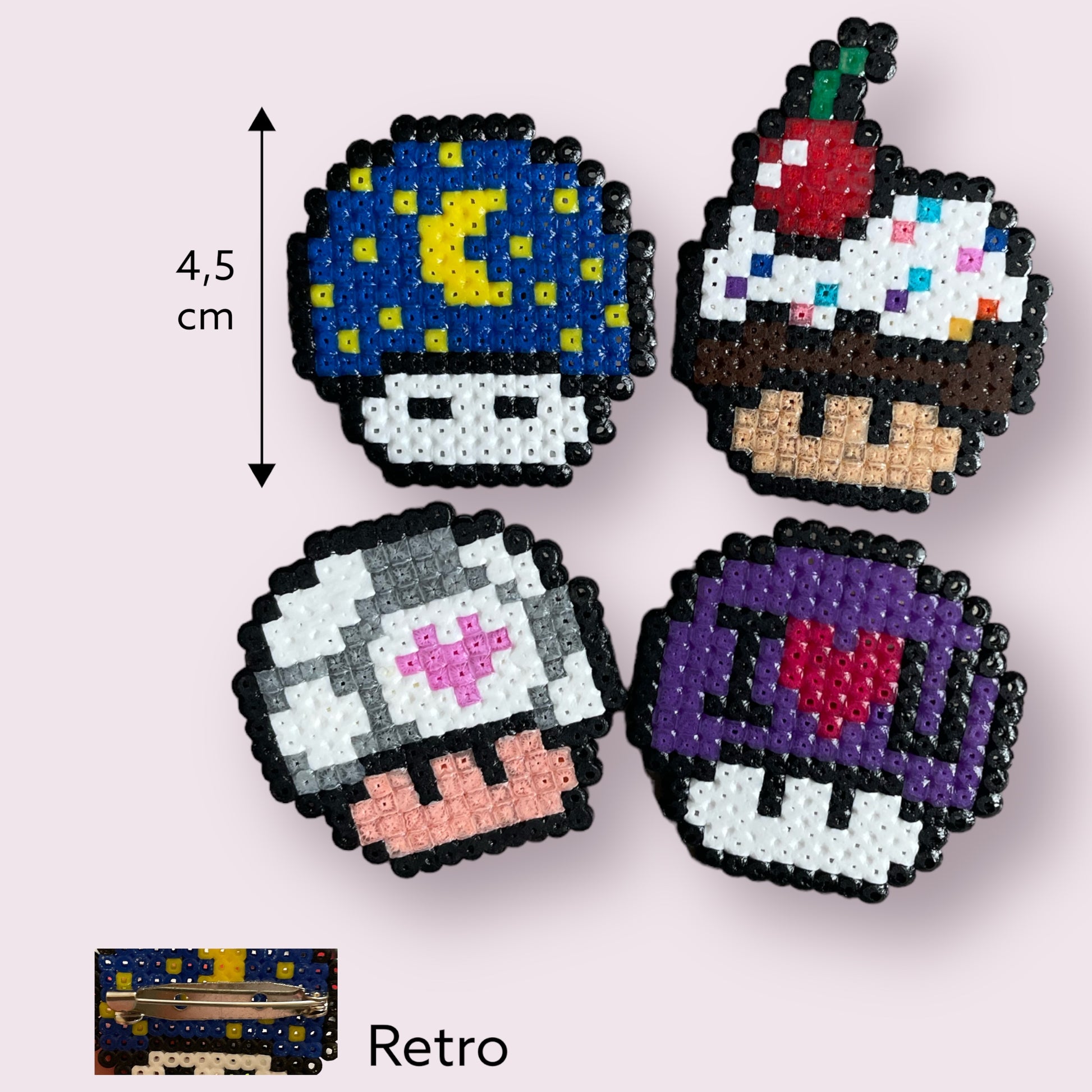 Dove i funghi si trasformano in piccoli pixel di magia! Uno rappresenta la notte stellata, un altro è un delizioso pasticcino fungoso, il terzo cuore è come un bacio pixelato, e l’ultimo porta la scritta “I Love You” con uno stile che trasuda amore digitale. Indossali per un trip pixelato di dolcezza e affetto, perché l’amore può essere ancora più speciale quando è fatto di bit e byte!